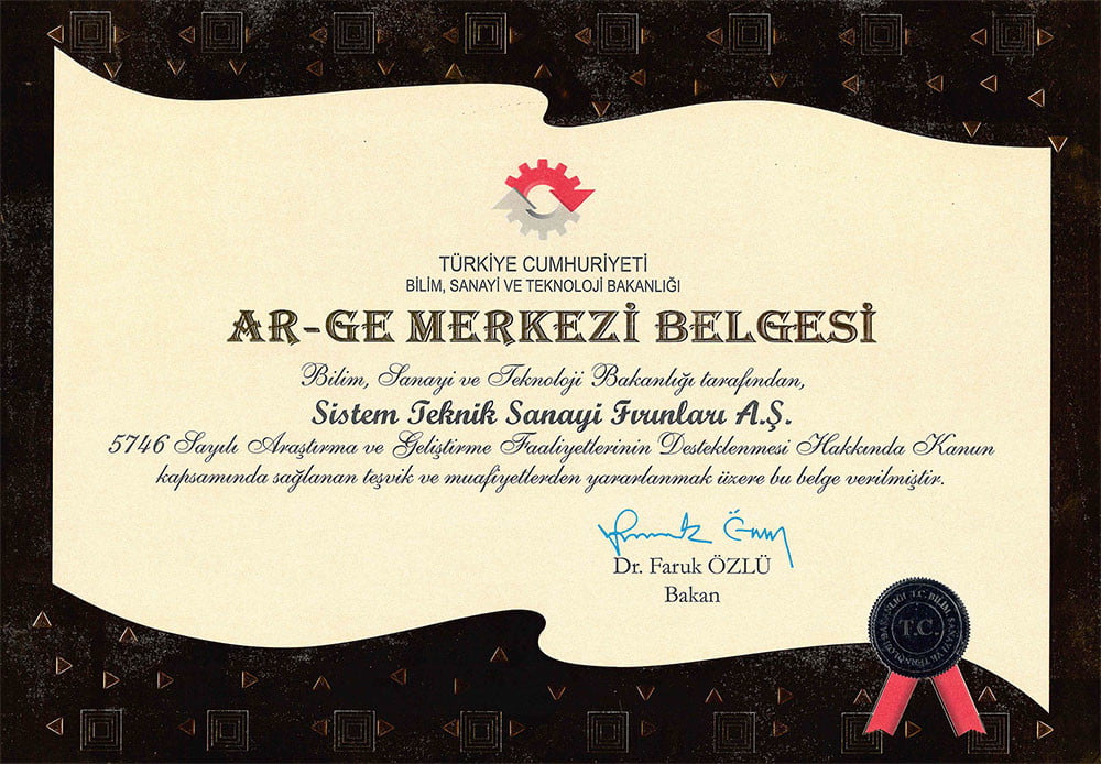Sistem Teknik Ar-Ge Merkezi Türkiye’nin 309. Ar-Ge merkezi olarak Bilim, Sanayi ve Teknoloji Bakanlığı tarafından onaylanmıştır.